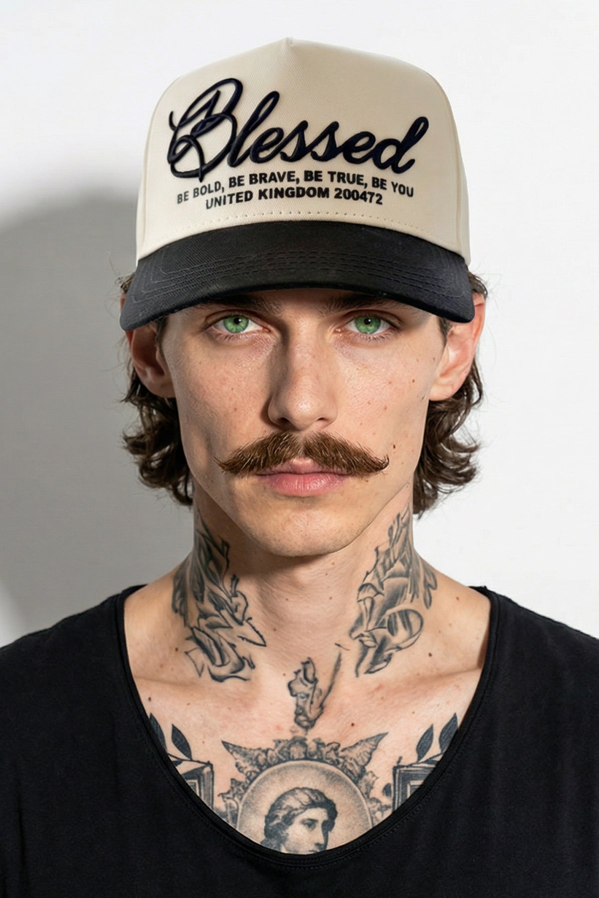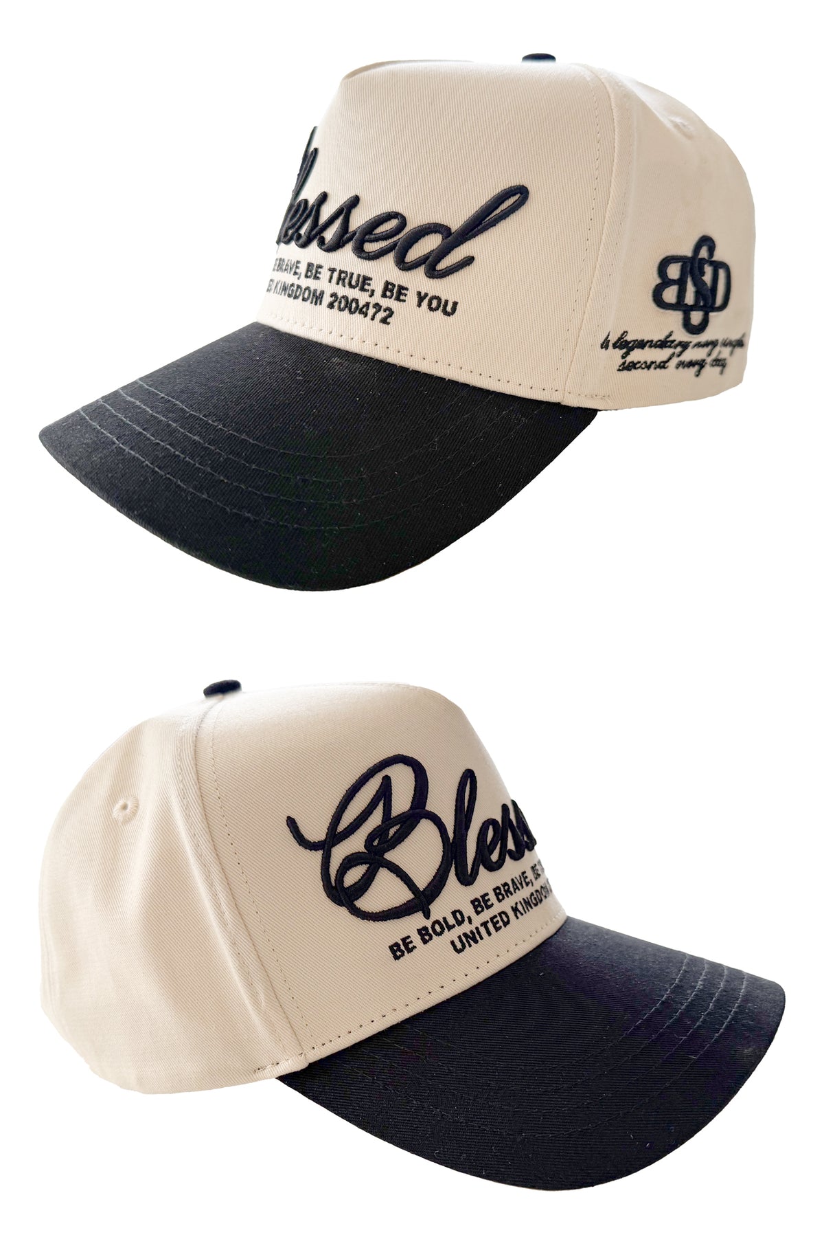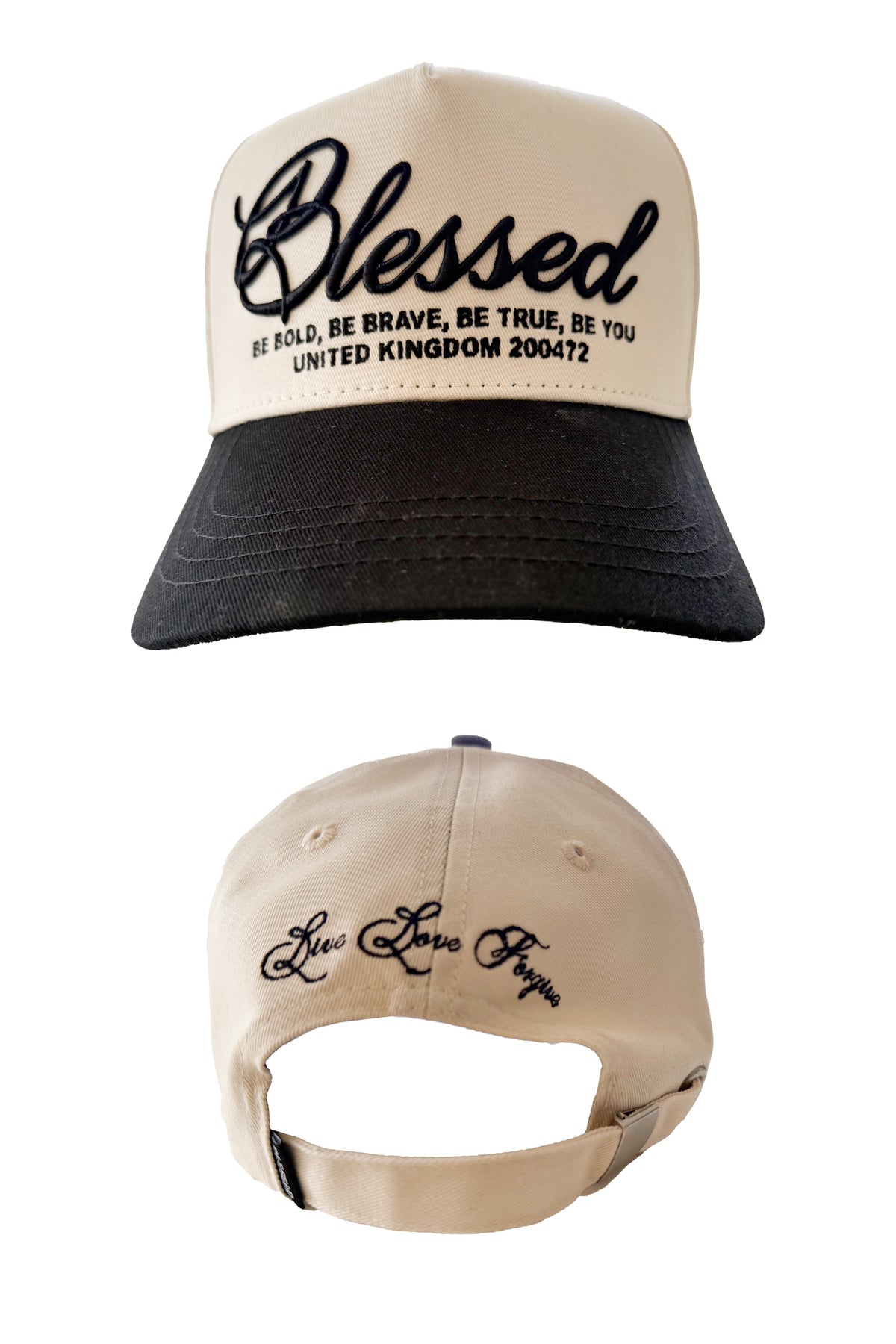 Refined and versatile, the Blessed Script Cap in cream and black delivers timeless style with a meaningful message. Designed with a soft cream crown and contrasting black curved brim, this cap features raised script embroidery on the front reading “Blessed,” paired with the empowering message “Be Bold. Be Brave. Be True. Be You.” Finished with subtle location detailing for a modern, elevated look.