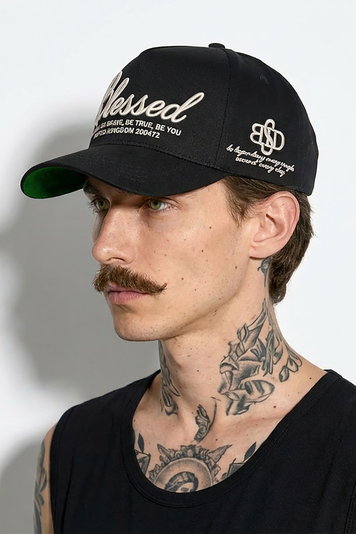 Minimal, meaningful, and effortlessly stylish, the Blessed Script Cap in black is designed for those who wear their mindset with confidence. The front features elegant raised script embroidery reading “Blessed,” complemented by a subtle affirmation beneath: “Be Bold. Be Brave. Be True. Be You.” A hidden dark green under-brim adds a premium contrast detail, giving the cap a unique edge without overpowering its clean black exterior.