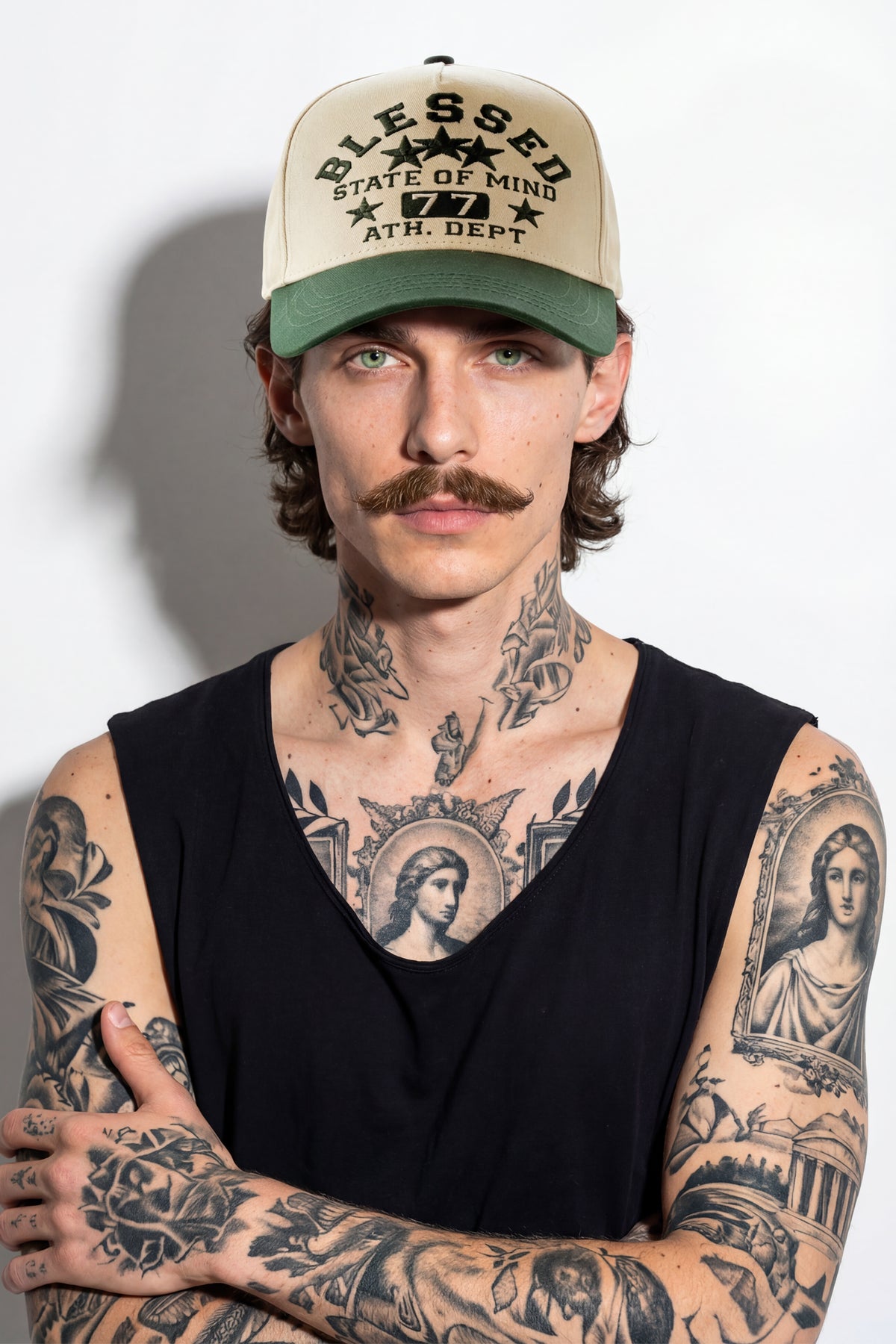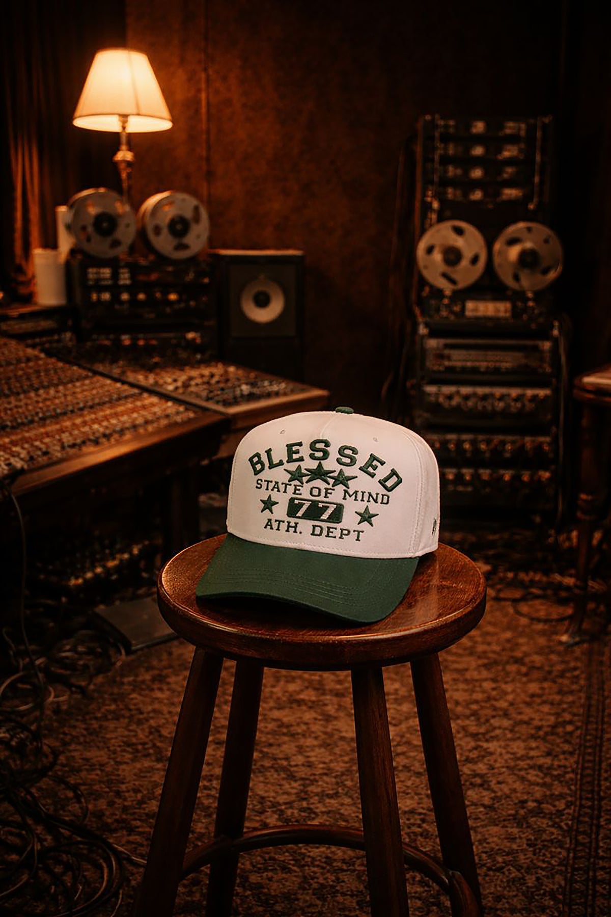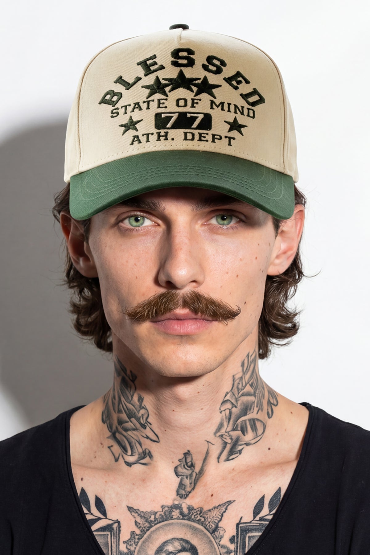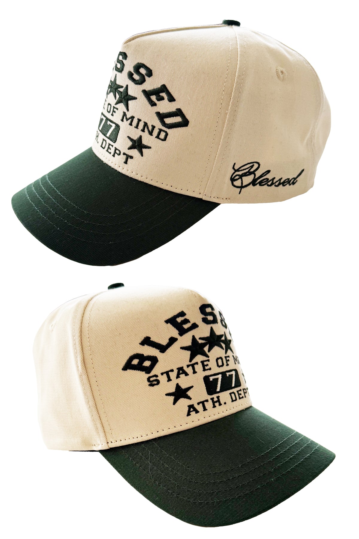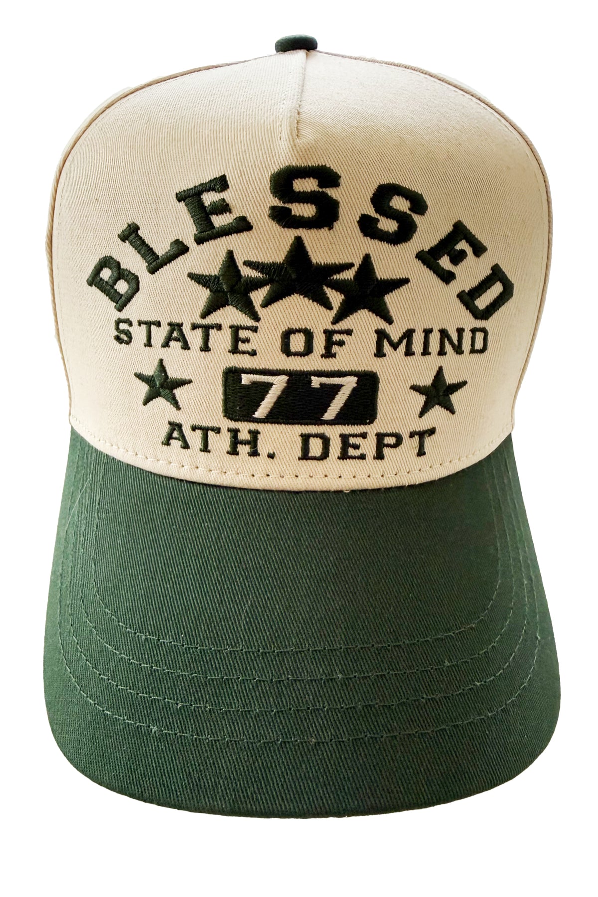 Make a statement with this premium two-tone cap designed for everyday confidence and comfort. Featuring an ecru crown paired with a deep green brim, this cap showcases bold embroidered lettering on the front reading “Blessed – State of Mind – 77 – Athl. Dept.” accented with star details for a classic athletic look.