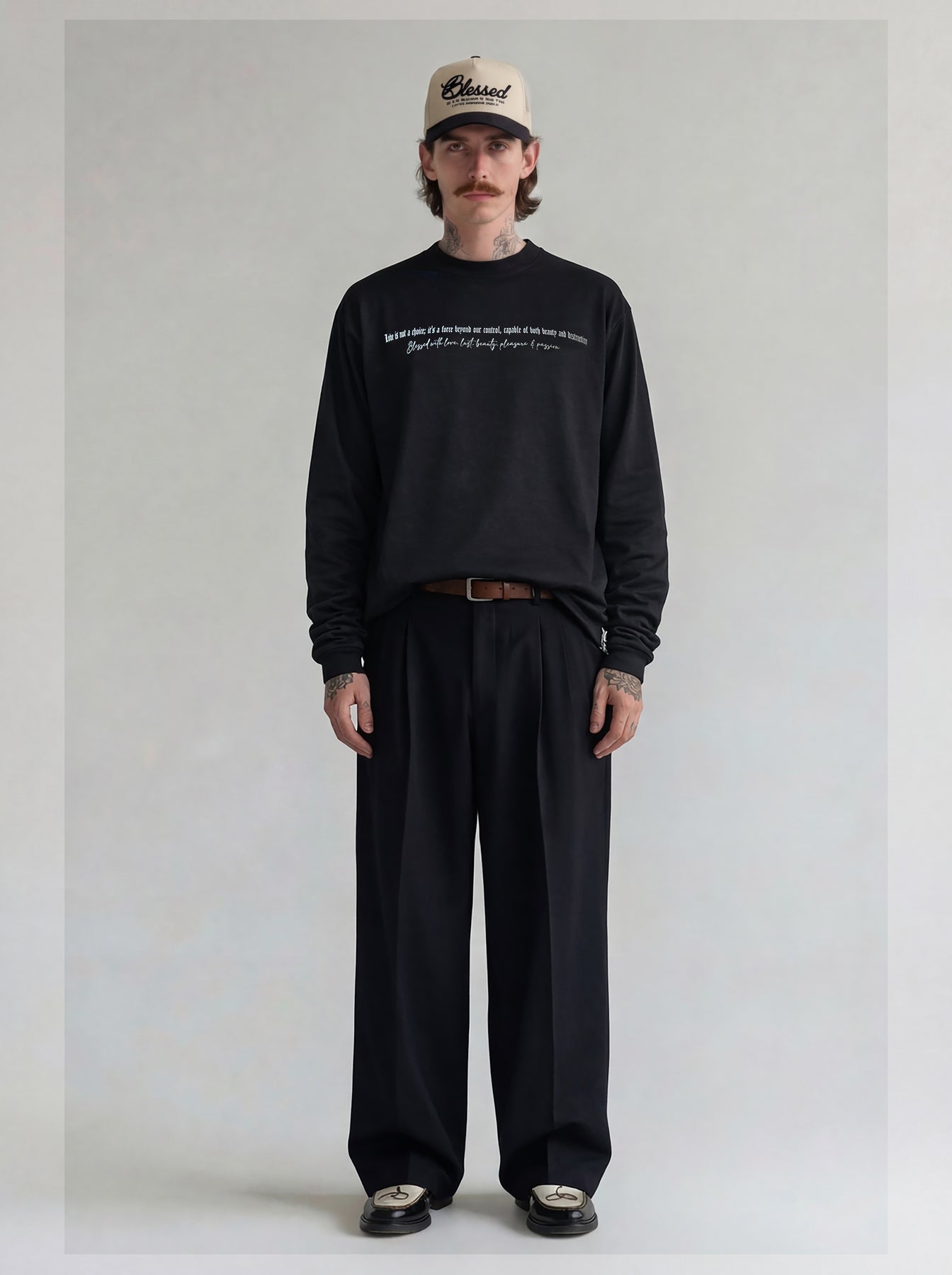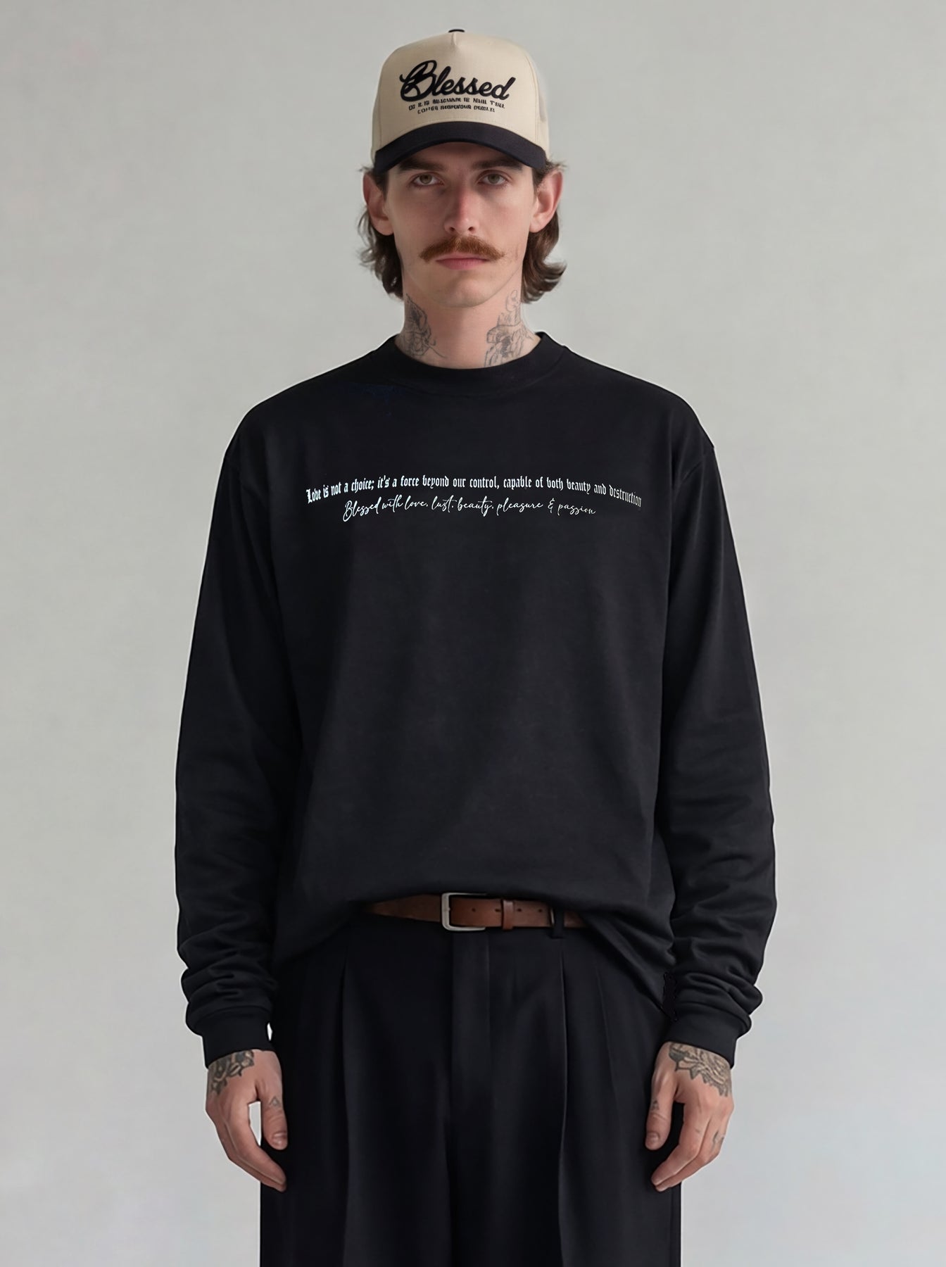 - Front of the T sports a 1 colour print that reads "Love is not a choice; its a force beyond our control, capable of both beauty and destruction"