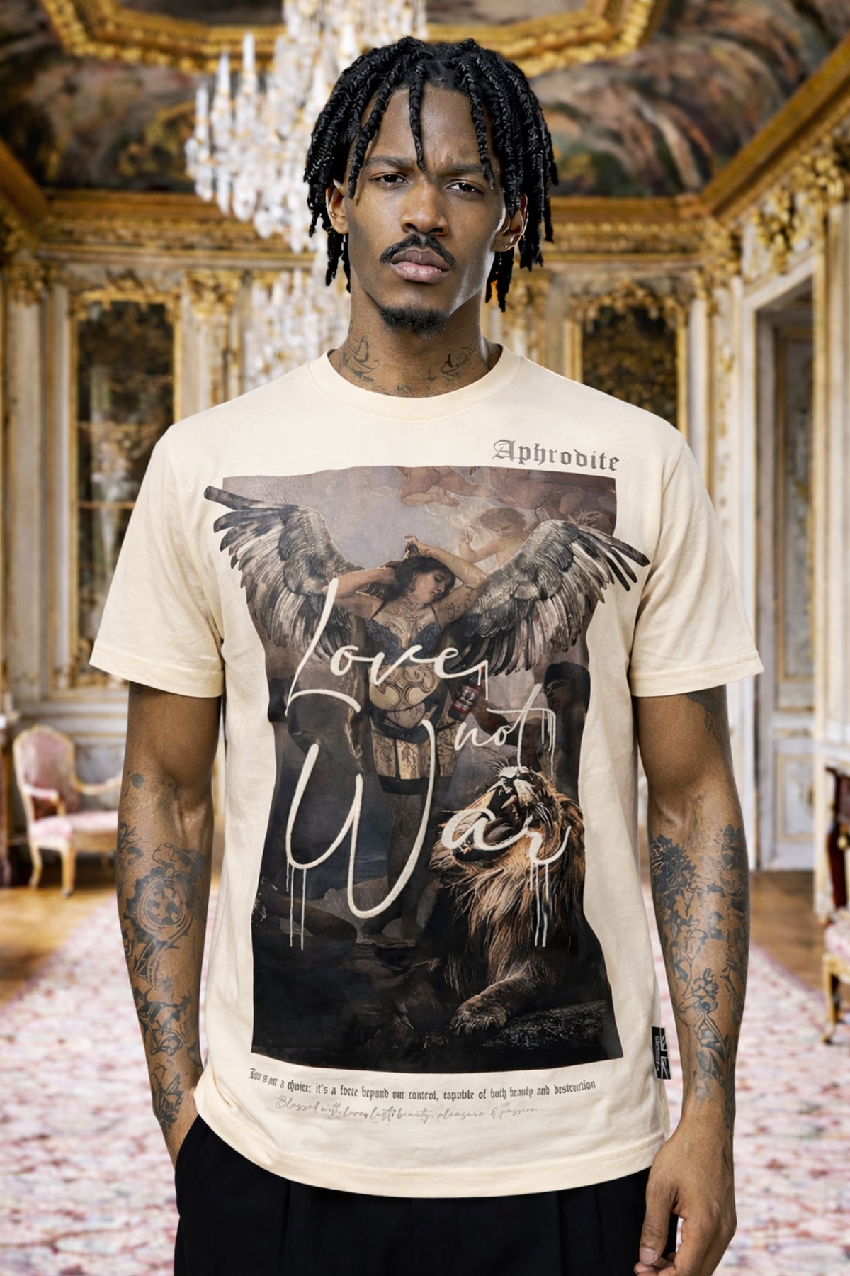 - Front of the T sports a full sized play on an old masters aphrodite painting print with a script embroidery overlay that reads "Love not War"